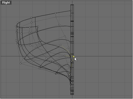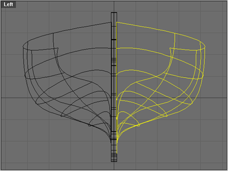 In the right view, select the point shown below and drag it about 5 units to the left. The hull is now prepared for a mirror operation.