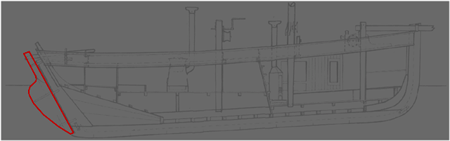 In the front view, zoom in on the rudder and trace over the background curve indicated by the red line above. Use a PolyLine for most of the curves, an InterpCrv for the left curve, and then use Fillet with a radius of 2 on the sharp corners.