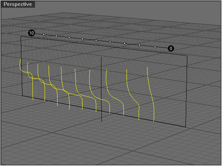 Draw a curve from 10 to 0, which is the approximate length of the hull. Select the curve and use the divide command curve/point/divide curve by/number of segments. Enter 10 when prompted for 'Number of segments'. This puts 9 points evenly spaced down the length of the hull.
