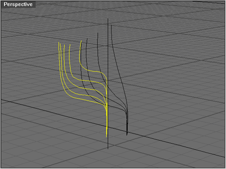 Select the 6 curves that form the rear of the boat, shown selected below. Turn on the 'end' osnap. With the perspective view active, hit Rotate3d (Transform/Rotate3d), select the top and bottom of the centerline, and enter -90 degrees. In the front, view drag the curves to your left by 2 grid squares.