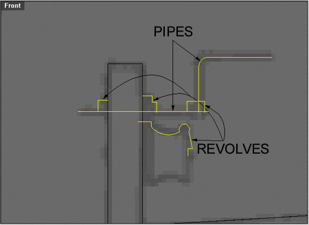 Use the Revolve command on the curves indicated by the "REVOLVES" arrows above, and use the Pipe command on the handle and shaft indicated by the "PIPES" arrows, to produce the main winch shown below.