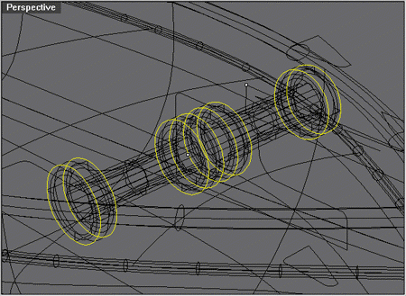 Turn GridSnap (s) on and with the new extrusion selected hit Scale2d use the the 'Copy' option and select the center of the ribs. At the 'scale factor' prompt type .85 enter and then hit Esc. This will create 2-winch ribs, 1 for each winch, one smaller than the other. Shown below.