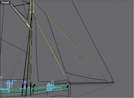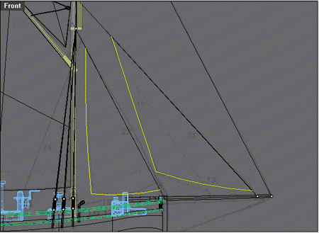 On the two foresails hit EdgeSrf and pick the right hand (longest edge, but not the 'stay') of the sail first and then the other two to finish the triangle. Order is important for this operation. EdgeSrf the other foresail. Below is the finished sail with PtOn.