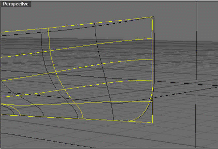 Another method for creating the hull, favored by Mikko Oksanen, which definitely has some advantages for this hull in particular, is to take the first bow curve and instead of curving it back, is to just keep it straight as shown below. There is a file on the CD-ROM in the boat directory called Opt_1.3dm to use for reference.