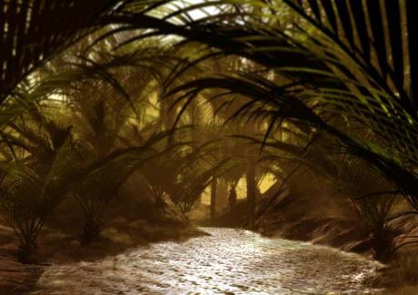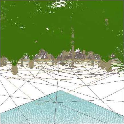 | Lonnie Bailey rendered this image "Tropical Stream" to see if Ray Dream Studio 5.0 (running on his Mac OS system) was capable of handling the complexity of a natural environment. Lonnie Bailey is a graduate of the Art Center College of Design, where he majored in Fine Art and minored in Illustration. He now lives near San Jose, in the heart of Silicon Valley. Lonnie works for SCS America, where he designs and illustrates web sites. You can send e-mail to Lonnie at baily19@netmagic.net, or explore more of his work his web site. Lonnie rendered this scene in Ray Dream Studio 5.0 by MetaCreations, along with the support of a variety of other Mac OS programs. The wireframe below is almost solid with lines, showing how many intricate models were used in the scene. While Tree Professional by ONYX Computing made the creation of the tree models simple, and CloneIt software by ZenStar facilitated the duplication of the plant life onto the terrain, the rendering itself took many hours. He also used Adobe Photoshop and MetaCreations (formerly from Fractal Design) Painter 5 in creating the image. "The most important thing I learned in this," says Lonnie, "is that sometimes things are better done in post editing, rather than trying to model complex objects or intricate detail." |