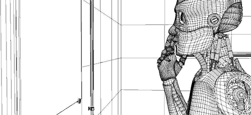 The head of the robot was initially built out of NURBS, based on digitized front and side view drawings, but later components were converted to polygons to optimize the polygon count and continuity (when he was working in Softimage with no continuity tools.) In the end, he used the rounding tool on some of the low-res polygon meshes to complete the smooth-looking model.