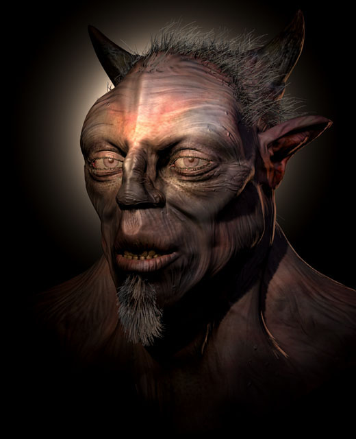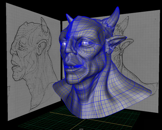 | Alex Alvarez created "Grehm" as a personal project in Maya. Alex is the Founder and Director of the Gnomon School of Visual Effects in Hollywood, CA. He learned to use Alias software while he was an Illustration major at the Art Center College of Design, and later worked as an Applications Engineer at Alias|Wavefront before he founded Gnomon. You can see more of Alex's work on his web site. Alex started this portrait by making drawings of the character from front and side views. As shown in the screenshot below, he used the drawings as image planes (templates) to guide his modeling in Maya. Alex used patch modeling, assembling the head out of about 200 NURBS surfaces, with all of the rectangular NURBS surfaces seamlessly stitched together like patches in a quilt (the thicker blue lines in the wireframe show the edges of the individual NURBS patches.) All of the detail was modelled manually, pushing and pulling vertices to sculpt the surface. Alex painted the color map, a bump map for warts and wrinkles, and a specular map, all using StudioPaint 3D from Alias|Wavefront. The head was "skinned" (linked to the skeleton) with a new Maya 3.0 feature called a "wrap deformer." To use a wrap deformer, you first build a low-resolution polygonal version of your character, and then the wrap deformer allows the low-res object to function as a deformation object for the high resolution NURBS surface. Only the low resolution polygon mesh needed to be skinned to the joints in the skeleton, which allowed overlapping cluster deformations to more naturally pose the character. |
