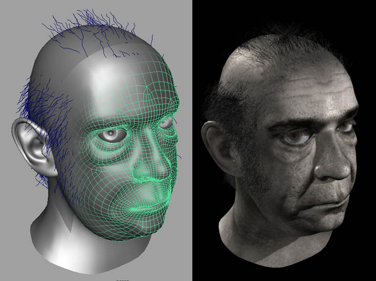 Dylan is a 3d artist now working at Reflexive Entertainment in Lake Forest, CA. (Their latest project is a strategy game called Star Trek: Away Team.) Dylan received a MFA in computer animation from the Rochester Institute of Technology, and has a background in illustration. In the future, Dylan says he'd "love to enter the film industry at some point, as a character modeler/texture painter. To be honest I'm not sure which appeals to me more, modeling or texturing, I love the entire process." You can see more of Dylan's work on his web site, www.Dylan3d.com. Dylan usually tries to get "a lot of reference, the more the better," when planning a project. On this project, he had only collected reference for modeling the head, because "this was originally only supposed to be a head study, a personal experiment with black and white painted textures. I liked the result so much I continued on, making it up as I went. Not a technique I would usually suggest." Dylan is traditionally a NURBS modeler, but he's recently learned to model in polygons. He likes the advantages of polygons that you can add details where they are needed, and that polygons don't suffer from visible seams as you sometimes get between NURBS patches. He usually models in NURBS, laying down the general shape, then converts the surfaces to polygons, goes in and adds the detail work, and finally merges the vertices into a continuous polygon mesh. He used Maya Cloth for the clothing. Most of the modeling detail work was done by pulling vertices, and using Artisan to smooth out pinching and irregularities. There are no displacement maps, and he's never had good results using displacements in Maya. Most of the detail work was created using bump maps. Even though he started from a reference shot, Dylan could not find anyone with the skin texture he was looking for. He ended up using the charcoal tool in Fractal Painter to create the pitted skin. He created a tiling texture in Painter, and brought that into DeepPaint 3D, where he used the clone tool to transfer the painted texture onto the model. His conclusion on the technique: "There are easier and more efficient ways of texturing but you have to remember this began as an experiment." The background is a photo he took in a local bar. He made it grittier, added contrast and desaturated it in Photoshop, and he modeled the bar itself so the character could cast shadows upon it. Regarding the Maya renderer, Dylan says "I've learned you can get a lot out of the Maya renderer if you're willing to wait, such as using dome lighting to fake radiosity and bumping up the shadow filter. These look nice but take an ungodly amount of time to render." Dylan rendered the hair out separately, and composited it onto the image as a post process. As a final touch, he also added some film grain. |