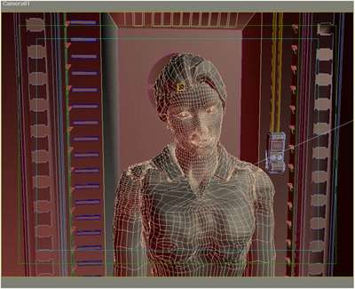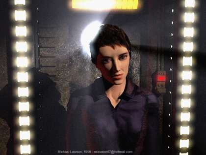 | Michael Lawson calls this image "Call," in reference to a character in the film "Alien Resurrection." He added this piece to his portfolio primarily in order to explore facial modeling. The specific subject was chosen partly because the "familiar face" would allow Michael to better gauge his success in modeling, and also because he "wanted to avoid long hair." Michael works at home in Toronto, Canada, and is seeking a full-time position in the industry. He is self-taught, and has been working in 3D graphics since 1995. You can see more of Michael Lawson's work on his web site, http://www.globalserve.net/~signnetwork/. Michael created the scene using Kenetix's 3D Studio Max. He "used dozens of photos of her from many angles to help refine the geometry," and then created texture maps including elements from those photos, in addition to painted details. To align the elements, Michael rendered a wireframe view of his model, and used it as a template for creating the maps. "The only real difficulty was in trying to create a resemblance to the actress," concludes Michael, "I've had mixed reviews, some people think it's great, others think it 'kinda' looks like her if you 'look at it the right way.' Oh well, you can't please them all." The image below is a wireframe view of the scene in 3D Studio Max. |