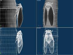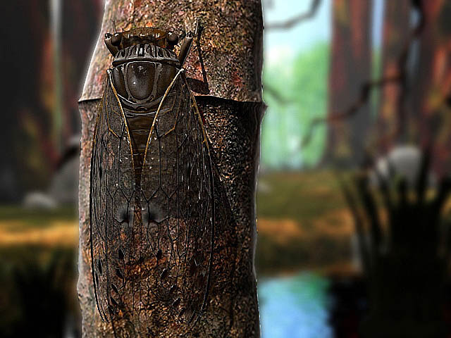 | Matthew Park rendered "Cicadas" in 3D Studio Max, as a shot for a TV series. He is working in Seoul, South Korea, but doing this project in collaboration with Idea Factory, based in Japan. Even though there are other modellers working on the project, Matthew wanted to model this insect because of his interest in nature. Matthew majored in industrial design in Korea, and plans to work soon in the United States. More of Matthew's work can be seen on his web site, www.matthew3d.pe.kr. After finding pictures of real Cicadas for reference, Matthew modelled the insect in 3D Studio Max, using NURMS, a new subdivision-surface variant which Matthew found to be very powerful. All of the textures were painted in a paint program (none were directly scanned from photographs.) Rendering included the use of raytrace shaders in Max, which allowed for shadows to be correctly calculated from transparency-mapped wings. |
