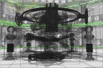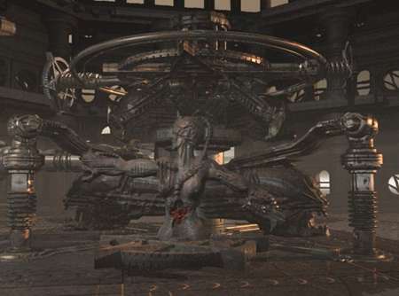 | Jac Grenfell rendered this image, called "Reality Engine" in Bryce 3D by MetaCreations. (The title has no relation to SGI Reality Engine graphics subsystems.) In Jac's words "The image was created as part of a personal, experimental series, to see if Bryce could be pushed beyond the norm, both as far as technique and picture content. The intention was also to expand on the idea of 'human interface': how far we allow ourselves to be enmeshed in our own technology of war and rapid advancement." Jac has degrees in English Literature and Art History, "and no real artistic training to speak of, although I have worked as a Graphic Artist and Typographer over the years." You can see more of Jac Grenfell's work at his web site, www.iconoptix.co.nz/kano/. Jac planned and laid out the work by drawing preparatory sketches, because he "finds it much easier to come up with ideas on paper than... from scratch on the computer." In terms of influence from other artists, Jac says "People have compared some of my imagery to Giger, but personally I am more influenced by Hieronymus Bosch, who I believe was one of the first masters of bio/mechanical/organic Surrealist art." The models were all created entirely in Bryce version 2, using Bryce's Terrain Editor. The Bryce software is primarily known for procedural renderings of landscapes. For designing your own landscapes and mountain ranges, it includes a Terrain Editor, which allows a user to paint a gray scale image, using white and brighter tones where the mountains should be higher, and darker tones where the terrain should be lower. "It really is a horribly inefficient way to model. The more I try to explain it, the more it seems absurd to [me]. I would think of a nose on a face as being a certain height for example, and the mouth being a different height." Jac then paints brighter shades where he wants a feature to stick up higher, and paints in black to lower features. Jac does all of the image painting and editing directly in the Terrain Editor, because if he worked in another application, such as Adobe Photoshop, he would lose Bryce's internal 64-bit precision, and also he would not see a realtime preview of the displacement. In order to use custom-designed terrains as "models" in a scene, it is possible to rotate, scale, and position a terrain within the environment, much as a displacement-mapped plane might be translated in other 3D applications. There is a clipping function that cuts out the terrain you've painted above a certain height, so that a black shade can be used for trimming the shape of the object. As we can see by Jac's work, a lot can be done with these terrains used as models. Many 3D applications do not support 64-bit displacement mapping, and would have trouble accurately rendering such a heavily displacement mapped image in a reasonable amount of time. From its humble aspiration as a landscape renderer, Bryce has developed a renderer built for displacement mapping. If even a small terrain file, in 512x512 size, were exported as a polygon mesh, it would become a DXF file 35 megabytes in size, difficult to render in most other 3D programs. Terrain objects do have some limitations, however. If the human figure in this image were viewed from the side, you could see that she is a "symmetrical lattice" - a cheat to make terrains look more like a fully three-dimensional object, which basically displaces the same terrain in both directions, giving her all of the same features on her back as her front. This makes her "next to useless for any kind of animation. From the side, s/he looks more like a crude mountain than anything else!" says Jac. Jac Grenfell wrote a tutorial for Visual Magic magazine, which covers more aspects of Bryce's Terrain Editor. You can read the article on-line at www.visualmagic.awn.com. The image below is a wireframe view in Bryce of the scene's layout. |