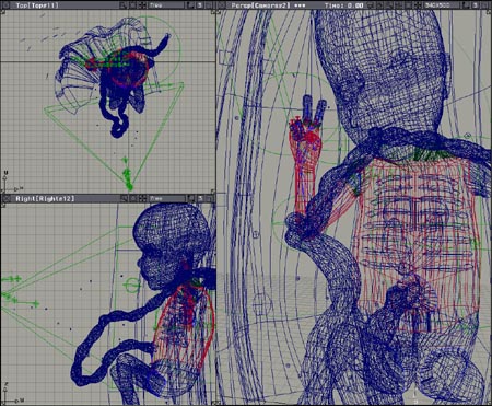 I modelled, animated and rendered "The Zootus" in Alias Power Animator. As a use of 3D animation in a show opening, I think that a finger-spelling fetus is a nice change of pace from all of the 3D text that we see in so many programs. Rick Austin proposed the idea, and he and Josh Greenberg supervised the project as I created the graphics at Palomar Pictures. This is what the model looked like on the screen of the SGI.