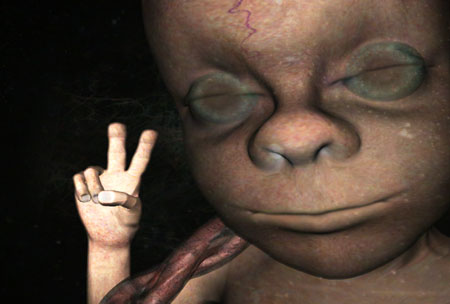 The opening sequence was rendered in 18 layers, and composited together at 525 Post Production, with Flame artist Glen Bennett. Since each element, such as the head and the umbilical cord, was rendered separately, little tweaks like softening the edge of the head (see where it covers the umbilical cord) were possible in compositing them together. Also, I shot one live-action plate of water with added couscous in a fish tank, which nicely complemented the eight other layers of particles that were rendered in Alias. |