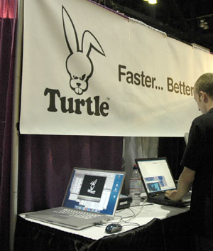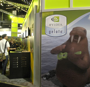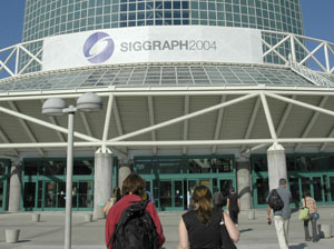SIGGRAPH 2004 - Los Angeles Report and Pictures by Jeremy Birn. This year SIGGRAPH had originally been scheduled to meet in Atlanta. In the wake of the conference losing a lot of money on the under-attended San Antonio SIGGRAPH of 2002, SIGGRAPH 2004 was moved back to LA to lower costs and increase attendance. Now we'll have to have two LA conventions in a row, meeting in LA again next year, then on to Boston in 2006. The Incredible Shrinking Expo The Exposition show floor, where the companies set up booths, was smaller than ever this year. You could cover it in an hour or so, and then come back for specific presentations, such as software demonstrations or talks by leading studios scheduled at software company booths. Of course, this is still a must-see trip, especially if someone is seriously shopping for software, and there were some interesting new offerings on display this year. Gelato I was eager to get a first look at Gelato, the new hardware-assisted renderer from NVIDIA that takes advantage of the GPU (Graphics Processor) on nVIDIA Quadro graphics cards in addition to the computer’s CPU. It is hard to judge a renderer from a version 1.0, especially one working in a new paradigm that is still being developed. The images being produced didn’t look much different than what you’d expect from ordinary software rendering*; they had a short animation of walrus that looked as if it could have been rendered in the Maya renderer. The speed improvements or increased cost effectiveness on render farms were hard to verify from looking at the demo at the booth, but the company says they believe Gelato currently works twice as fast as a result of doing some of the processing on GPU's. (Evaluation copies available here.) What's impressive about Gelato is not so much what they had to show this year, but the potential for what it might grow into in the future. It might not have crossed a threshhold where everyone feels a need to run out and buy it yet, but if GPU’s continue to grow faster every year at a rate exceeding CPU’s, then much greater performance gains could be achieved over the next few years. Depending on how things develop, it might become normal in the future for most renderers to utilize available GPUs for some portions of their rendering. Only time will tell how this market shapes up, but Gelato is definitely a product worth keeping an eye on. *The terms "software rendering" (computed on CPU only, without a graphics card) and "hardware rendering" (relying on a graphics card) could be misleading - we are clearly talking about software-governed computation in both cases, just using different chips. The Turtle Renderer I stopped by another booth, Illuminate Labs, to see yet another version 1.0 of an alternative renderer for Maya. The Turtle Renderer had a mix of some well-implemented features (raytracing, photon mapped GI, final gathering, sub-surface scattering), but some things not available yet (no hair, fur, volumetrics.) It appeared to be running quickly on a Mac G5, it had a nice real-time preview mode that allowed you to move the camera while previewing the render (although version 1.0 didn’t have interactive previewing while moving lights or adjusting shaders yet.) It appeared well integrated into Maya, using existing shaders and lights, but adding a few of its own render options as well. Its main claim to fame was being faster than Mental Ray at most tasks, and it also appeared to have a few different options for how Photon Maps were distributed. (The cost was $1000 for render node licenses. Evaluation copies available here.) |