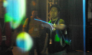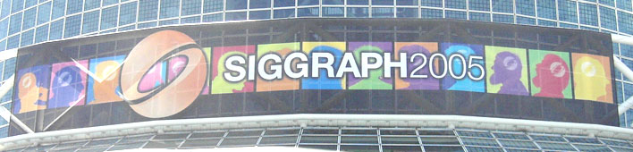 SIGGRAPH 2005 - Los Angeles Report and Pictures by Jeremy Birn. The SIGGRAPH conference usually alternates between meeting in California and meeting in another part of the country, but this year was an exception, meeting in Los Angeles for the second year in a row. The conference center was built in an area in need of urban renewal, and unfortunately the area has yet to be renewed. On the Saturday and Sunday leading into the conference, attendees became acutely aware that stores and restaurants shut down at night, and nearby sidewalks were desolate except for conference-goers and the homeless. The Best of Times, The Worst of Times In a cyclic industry, it's always nice to be in a boom, as we most certainly are in CG features. The conference was full of studios that were hiring, and there was competition for the most experienced and talented employees. Many studios had posters up at their booth for upcoming projects, and the sheer number of upcoming 3D animated comedies is staggering. In a flood of CG films, most likely all of them won't be hits, so there might be fewer CG films going into production in a few years than there are now - but this kind of issue is exactly why our industry is cyclic. At the same time, the Expo floor was small, so small that unlike last year they could put the registration area into the same hall as the Expo. And attendance was low, apparently about 30,000 people, half the size that SIGGRAPH reaching in the late 1990's. Most of the attendance decline seemed to come from companies with more restrictive policies about how many of their employees would be given time-off for SIGGRAPH. While SIGGRAPH is an unparalleled educational experience, it also is a place to party and meet old friends and colleagues, and a place where people are recruited and offered jobs. Perhaps the studios that didn't let employees attend SIGGRAPH were not just worried about this week's productivity, but afraid of losing their employees. SIGGRAPH: The CG Fieldtrip The trend towards SIGGRAPH becoming populated more and more by students continued this year, with several schools making a field trip out of the conference, and students finding it easier to visit SIGGRAPH during their summer vacations than professionals who had to work. Schools and CG training centers made up a significant portion of the booths at the expo. CG education is a business that is always profitable, whether production studios are doing well or not. Despite the fact that we are in the "boom" phase of a cyclic industry, there are already far more recent graduates with CG educations than can be absorbed by the job market. This situation seems likely to get far worse over the coming years, if the industry slows its expansion while all of these schools continue recruiting new students as fast as they can. |