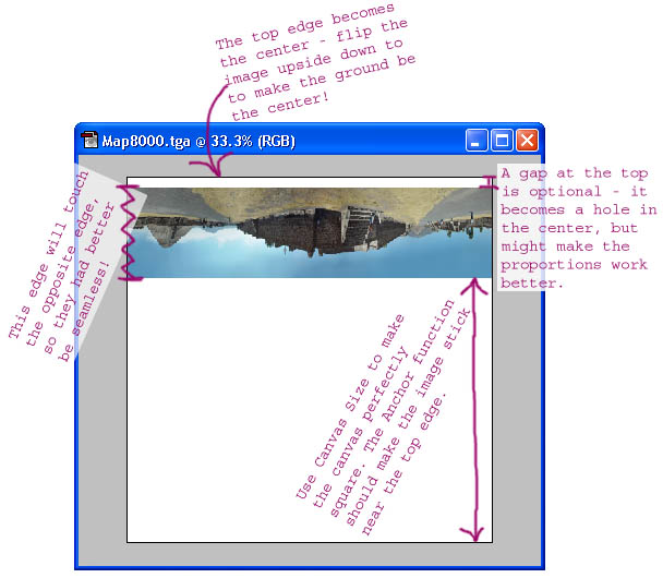 3. Using Panaview Image Assembler again, I wrapped the left edge together with the right edge to make them seamless and bring the two sides into alignment. This cropped the image, but then in Adobe Photoshop I cropped it some more and cleaned up some imperfections. Some people stop here and make this kind of panorama as their final product, although the long thin shape makes them hard to print and display. Because the left and right edges will seamlessly connect together, printing large images like this on translucent material would make a nice lampshade, although I haven't seen anyone manufacturing those yet. To create a perspective that can be printed as an ordinary photo print with dimensions such as 8" x 10" or 11" x 17", you'd want to wrap the 360° view back into a circle. NOTE: An alternative to steps 4 though 7 below is available if you use any 3D rendering software - try using the panorama as a texture map wrapped around half of a sphere, and rendering an orthogonal perspective on it. Your different texture mapping controls and rendering options will allow for more adjustment over the perspective than you could achieve by finishing the project in Photoshop. 4. Because the seamless image I started with was over 18,000 pixels across, I made a new copy scaled down to 1000 pixels in width. If you scale your image smaller you can experiment with steps 5 through 7 until you are happy, without wasting too much time processing a very high resolution image. 5. In Photoshop, flip the image upside down, if you want to produce a ground-centered panorama. 6. Increased the Canvas Size around the image to make it a perfect square, leaving most of the canvas below the image empty. The next figure shows some guidelines for how to prepare your image: