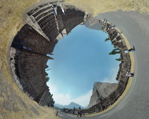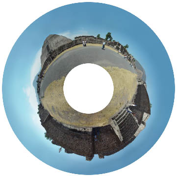 8. You may want to undo your initial results and experiment with changing the position of your original image within the canvas, or with scaling the image up in height, and then redo step 7 until you are happy. If you are working with a scaled-down original image, then eventually you will want to go back and repeat the process with a higher resolution image. Remember that you only need the original to be about twice as wide as it is high in order to get consistent resolution. NOTE: An alternative to Photoshop's Convert Polar Coordinates is the much more versatile Flexify plug-in from Flaming Pear. Flexify doesn't crash as often when wrapping larger files, has better anti-aliasing, and has far more features for creating other kinds of projections. It does sometimes create glitches such as a grey bar a few pixels high cutting across your output, but this has been retouchable and it could be worth the $20 if you want to make a very high resolution Polar Panorama. 9. If you left any space at the top of the image before using Polar Coordinates, then you will have a hole in the center, as shown above. Cut and paste lassoed areas of the image to fill in the hole, or use the cloning tool to duplicate other parts of the ground. If you want to get fancy, you could shoot a separate picture of the ground and composite it into the hole at this stage. 10. Clone the sky outwards to fill the rest of the canvas, or just crop the canvas into a smaller rectangle to frame the area in the center of your polar panorama. More creative manipulations with functions like Filter - Distort - Spherize could help improve the proportions on some shots. The final product can look like the image as the top of this page. As an alternative, if you don't want the ground to be in the center of your panorama, then you don't need to flip the image upside down in step 5. The result can look like the image below, with the sky in the center of the image: