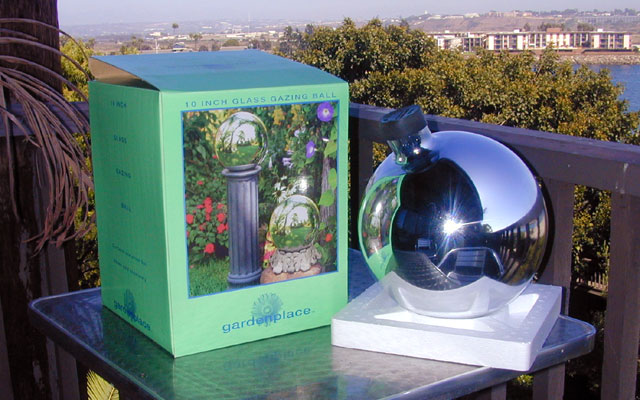 p.272 I mentioned that you could get reflective mirror balls sold as lawn ornaments or security camera housings. The one I was using was a 10 Inch Glass Gazing Ball (click here for a picture) from the garden center at Target in Manhattan Beach, CA - note in the picture that there's a knob at one end of the glass balls, which isn't there on the more expensive metal ones. If you don't need balls as big as mine, you could just use a christmas tree ornament for experiments.