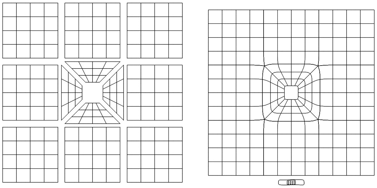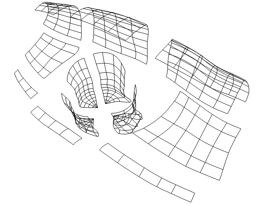 The center four surfaces of this pattern were the four quarters of a leg in this tutorial. This is a useful pattern that recurs many times in NURBANA models. The next tutorial uses the same basic pattern to insert an eye into the surface of a head.