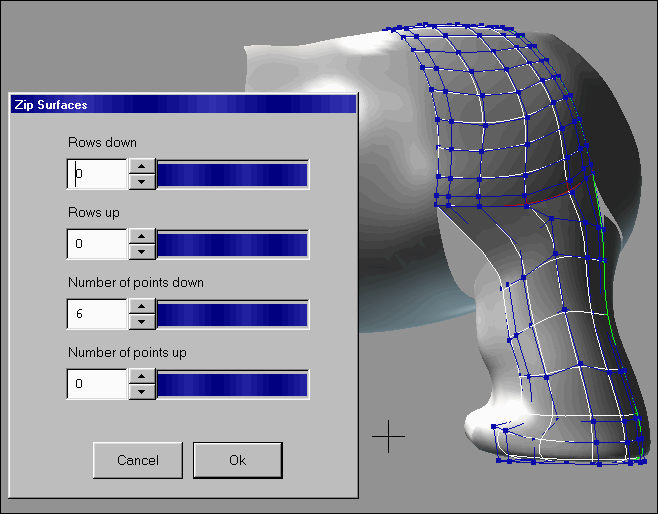8. With the two surfaces Multi-Selected as shown below, choose Draw>Zip Surfaces. Click the lower left corner of the selected body surface, and choose the horizontal row of points running along the bottom. Next click the upper left corner of the selected leg surface, and choose the horizontal row of points running along the top. Connect all of the points with the Zip Surfaces dialog as shown below.