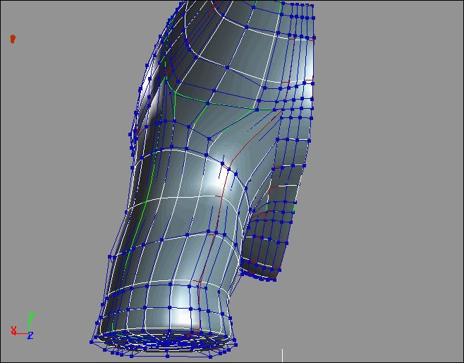 6. Multi-Select the outside panel of the leg, and the body surface immediately above it. Double-check that the two surfaces are ready for zipping by turning on Show>Edge Flags, and checking that the colored edges indicate the same directions on both surfaces. For example, if the body segment is green on the right and red on the bottom, then the leg segment should be green on the right and red on the bottom. If the edge flags do not match, single-select the leg surface only, and use Effect>Curve Controls to Swap U and V, Inverse U, or Inverse V.