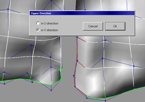 5. Click on the CV on the lower left corner of the other model, and choose the V direction. The Zip Surfaces dialog will open. Slide the Number of Points Up slider all the way to the right, until both surfaces are joined together. Click OK. The two surfaces will now be touching each other, with no visible gap or space between them. However, there will still be a sharp change of angle and curvature along the seam between them.