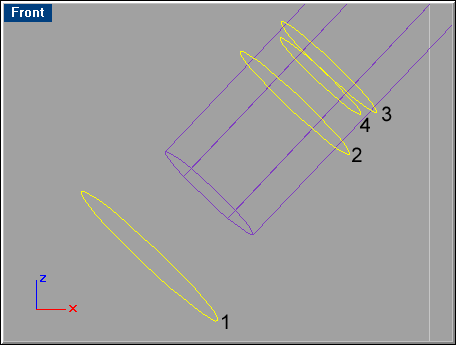 Zoom in on the bottom end of the lofted surface and skin together the curves in the order shown below. NOTE: Execute the loft command before selecting anything, so that you can select the curves in order. Use automatic direction when you see the arrows of the curves. In the Loft options panel choose Tight lofting style.