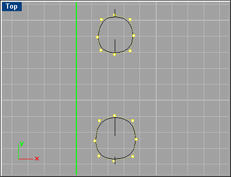 In the Top viewport, draw a closed curve for each leg as shown below. Make sure they lie on top of the curves from a side view. (Your current scene should be similar to the sample file 'brachio7.3dm' from the CD-ROM)