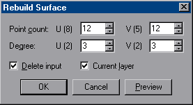 To make the sphere more dense, use the RebuildSrf command, and in the Rebuild Surface dialog box use a point count of 12 in both directions. This will give you enough points to squash, manipulate, and reshape the surface by dragging selected CV's.