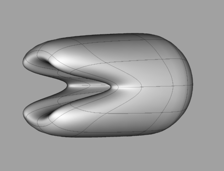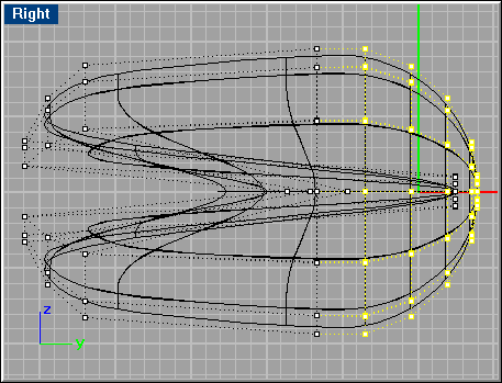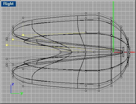 Make the CVs visible with PtOn and in the Right Viewport. As shown below, select the CVs in the middle and pull them inwards as a start for the basic shape of the mouth. Use DynamicShadingPerspective to see the shading while editing.