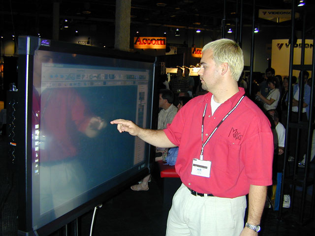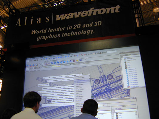 Alias|Wavefront had a lot to show at its booth. Adapting technology from their unique "Paint Effects" into 2D, Alias|Wavefront announced a Paint Effects plug-in for Adobe After Effects and Maya Fusion. While the plug-in obviously couldn't do everything that 3D paint effects on 3D NURBS curves could do, they seemed to support animation and to offer some unique creative possibilities. They were demoing Paint Effects in a "Finger Paint" arrangement, on an interactive touch-screen.