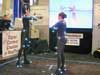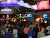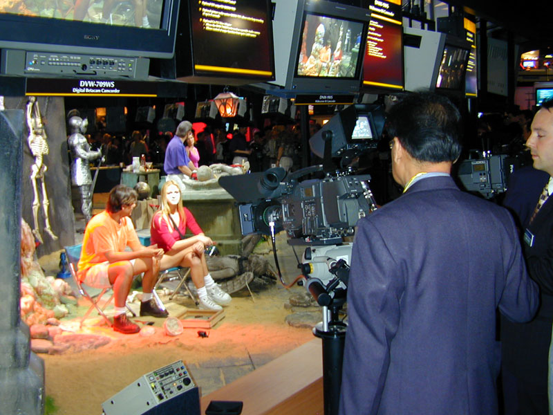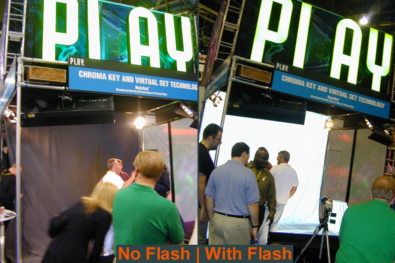 Several booths were demonstrating hardware and software for virtual sets around live actors. Most used realtime camera tracking to match camera moves, in combination with traditional bluescreen or greenscreen technology to remove the background behind the actor. Reflected light from blue screens poses the problem of blue spill, as seen below the actor's elbow in the first picture. Play's new Holoset technology used a new alternative to bluescreens, which appeared to be ordinary black fabric to the naked eye. However, it was a special lenticular cloth designed to be highly retro-reflective, such that it appeared to be glowing white when shot with a camera flash, and black under ordinary lighting. This kind of backdrop is photographed with special cameras, surrounded by a ring of pulsing lights, which allow the background to be removed behind an actor, with no blue spill and no need for special lighting.