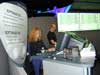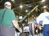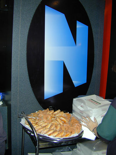 NewTek showed Lightwave[6] at it's booth, and announced a new "patch" [6]B, which is supposed to speed-up rendering, and adds or improves several modeling and rendering features. Lightwave's renderer has long been respected as a production-capable raytracer, and with version 6 NewTek extended it's capabilities to include global illumination functions. (Global illumination is a general term for indirect lighting, including techniques like radiosity and effects like caustics.) While many lower-cost programs support radiosity for diffuse-to-diffuse light bounces (including POV Ray and Truespace), Lightwave also can also render caustic effects (Caustics article) and uniquely supports High Dynamic Range Images (related web link) as a source of illumination. Especially important at a broadcaster's convention, NewTek was touting its Toaster 2 and Aura paint/compositing system, and their integration with Lightwave. Grateful guests to the NewTek booth were also treated to Krispy Kreme donuts (picture) while supplies lasted.