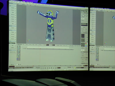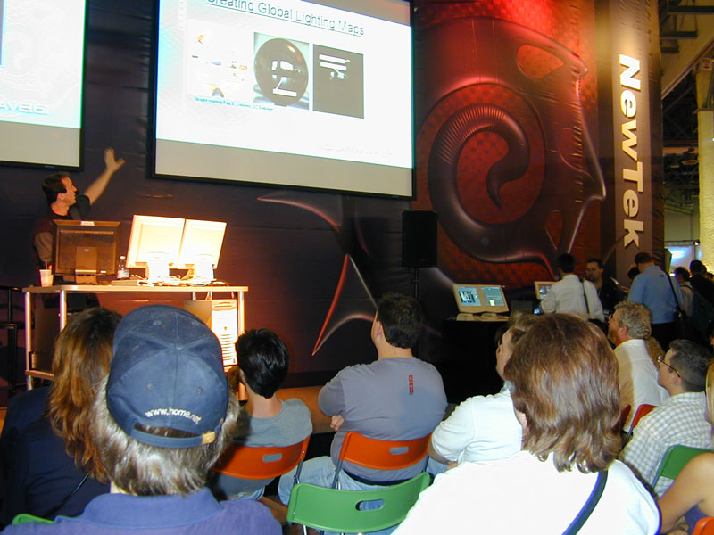 The main focus of the software demos, however, was the first public preview of Maya version 3 (link to press release). The new Trax function (A|W's attempt to compete with Softimage's Non-Linear Animation) looks good from the demo, especially in its easy support for splitting and re-merging clips. Maya's Artisan has also been extended to provide true 3D paint capabilities, in addition to its the many other functions that now use it's brush-based interface. In the rendering department, there appears to be a number of improvements, including vastly superior displacement map rendering, and new render pass support that automatically can render different layers of objects, isolate shadows and other render passes into different image directories, and improved integration with Maya Fusion for compositing.