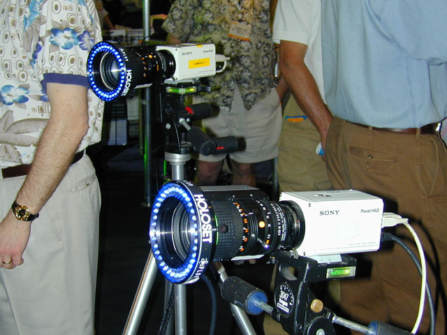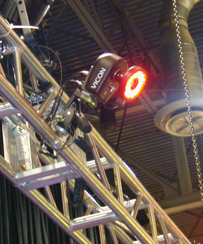 Optical motion capture was being used at several booths. In the past, while optical capture has been considered to be of higher quality than magnetic (and didn't require wires like magnetic sensors) it was more limited in its realtime capture abilities. MotionAnalysis was showing their optical motion capture system performing realtime capture on two actors at once, with no apparent problems of markers being blocked from view, and character motion that looked reasonably accurate with no clean-up or editing. Vicon was showing a new model of camera for use with optical mocap, which featured a megapixel resolution, to track smaller markers or more complex scenes.