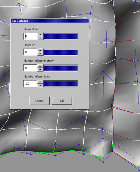 5. Click on the CV on the lower left corner of the other model, and choose the V direction. The Zip Surfaces dialog will open. Slide the Number of Points Up slider all the way to the right, until both surfaces are joined together. Click OK. The two surfaces will now be touching each other, with no visible gap or space between them. However, there will still be a sharp change of angle and curvature along the seam between them.