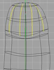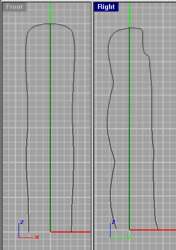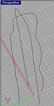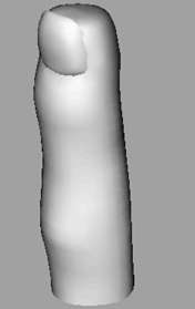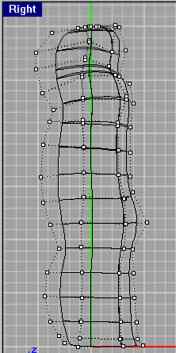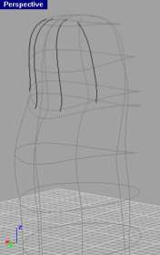 8. Select the finger, and "ghost" it, using the Ghost icon in the Layer toolbox. 9. In the right or perspective windows, you can now see that there are 3 sets of curves. The set of curves you drew is in the center, and there are curves projected onto the front and back of the finger. (The front window doesn't show you this, because they are all lined up with eachother along the depth (Y) axis.) 10. The only curves you need are the ones projected onto the back (fingernail) side of the finger. Select and delete the other two sets. 11. Loft together the 4 curves to make your fingernail. (Turn off the "closed" check-box.) 12. If you want, you can show points and edit the shape of the fingernail. 13. Move the construction curves into the construction curves layer. |