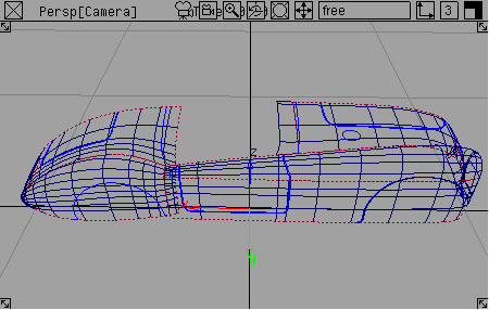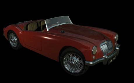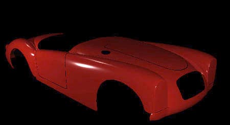Greg Newton hails from Detroit, Michigan, and thought that building and rendering this model would be "the cheapest way to have his own mga." Greg now works at Midway Games in San Diego, and previously worked in Detroit doing automobile visualization. Greg thanks Mark Adams for advice with surfacing, and thanks Duncan Brinsmead for advice on the car paint shader. You can send e-mail to Greg at newt@midway.com. The modelling and rendering were done in the same way that most cars are originally visualized at car companies: it was modelled out of trimmed NURBS, using Alias AutoStudio 6.0 through Alias Power Animator version 7.5 . The images below show the Alias wireframe just prior to trimming half of the car, and then a shaded view of the trimmed body. The curves on the wireframe surface show where regions will be trimmed to cut wheel-wells and other openings into the body surface. Greg worked hard to get smooth, realistically curving surfaces; most were created with bi-rail or square functions. Using trims allows the hood and doors to be cut from a continuous section of the body surface. Greg explains that the intricate wheel models "are just a bunch of bent tubes, instanced around a revolved cross-section." The realistic car paint shader has been adjusted so that you see more reflections when you look at the paint at an angle, than when looking at it straight-on. |