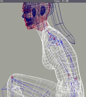 Steven Stahlberg created the "virtual actress" in this scene years ago, and although he describes his efforts in developing her as unfinished, he uses the model in renderings with Science Fiction and Fantasy themes. Steven says that this genre has been his favourite since he was a boy. This image is titled "The Pet" - probably in reference to the robot dinosaur. When asked if this work would have the same appeal to women as to men, he guesses that "to like it half as much [a woman] would have to be really into CG." One of Steven's dreams "is to be part of a team that wins an Oscar (or at least gets a nomination) for best lead role with a CG character." (At present, there is no Academy Award for individual animated characters - although an animated film could win for Best Picture, and awards can go to the director, music, and voice performers. The issue of whether a motion-captured performance, or a voice-over performance, can earn a best actor or actress nomination, without them actually having been filmed, has not been resolved.) Steven Stahlberg is the chief animator at Optimage Digital Studio in Hong Kong. Steven was born in Australia, grew up and went to art school in Sweden, and worked as a freelance illustrator in Sweden and Hong Kong for 10 years. In 1990 bought a used SGI Iris 4D 20, and started working in CG. Visit his web site, www.optidigit.com, to see more of Steven's work. The modelling, rendering, and animation were all done in Alias Power Animator. The wireframe view below shows a side-view of the character. "The hardest part was the face of the woman - it's still not right, but getting there." Steven says he regrets having built the head in all horizontal/vertical curves, and wishes he had used mouth-centered geometry instead. He also wants to avoid using a blend surface, which is now used around the mouth. (A lot more pictures of this character, and an animation, are in his gallery section under "studies.") In working on this character, Steven says he "learned a lot about anatomy and what skin looks like - you'd think that 3 years of art school and 10 years of illustrating full time would have done it, but it didn't." In addition to a detailed model, he also has built up 25 facial clusters, with keyframes for most standard muscle movements, although he is considering moving the head over to Alias's ShapeShifter system (in which the user defines facial expressions as target versions of the head model, instead of manually defining clusters of points and animating their positions.) |