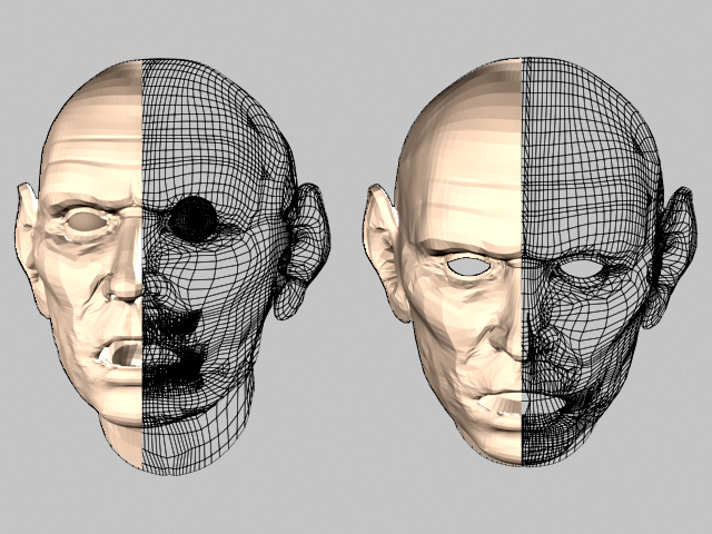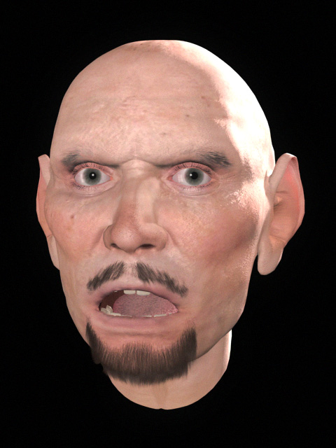 Salvo Severino lives near Catania in Italy. He studied at the Institute of Art, and started his career in arts as traditional painter/illustrator. Later, he bought a computer and started to create digital illustrations with Photoshop, and then eventually using 3D software. He now works for an italian company, creating characters and character animations. Salvo dreams of someday working on CG movies in California. His web site (under construction at the time of this writing) is at web.tiscalinet.it/sethos. This head is pure 3D, with no cheating or photographs. It was modeling and rendered in 3D Studio MAX version 3.1, and textured with maps that Salvo painted in Adobe Photoshop. Salvo began his visual research looking for photographs of old men and women. He then created the head through spline modelling, with the Surface modifier. The deepest wrinkles were created in the model itself, and the minor wrinkles were left for the bump map. Click here to view his materials and texture maps in a new browser window, and continue reading this while it loads. The head material is a Multi/Sub-Object containing 14 different materials. Salvo painted many texture maps, using photographs for color reference as he painted the color map, shinyness, specular level, diffusion, luminosity, translucency, bump, and reflect maps, and many masks to blend different materials together. He used 7 or 8 different mapping coords, the first is cylindrical, which includes the entire model and is used for almost the 80% of textures. Another cylindrical mapping was used for the nose, because the first coords would not work properly in this area. The others mapping coords are common planar projections used for ears translucency, the top of the head, teeth, tongue etc., except for the eyes which have spherical mapping. In all, there are 21 textures used. There are 11 2D and 3D procedural textures (noise, cellular and gradient.) Each eye was created using 2 spheres, the first one is a bit bigger and has 12% opacity, a high specular value, and a bit of reflection and bump. The inner sphere has the colour texture, diffusion and luminosity. The inner sphere is double-sided, and geometrically concave in the iris area, with a hole to simulate the pupil, showing the 2nd side of the material (internal) that is completely black (without spotlight nor luminosity.) It is possible to animate the hole wideness to simulate pupil dilation. The eyelashes were modeled as geometry, although all of the other hair was created with an evaluation copy of Shag:Hair by Digimation. There are 4 lights, the brightest one projects shadows, the other 3 give a natural lightness to the skin, although they also illuminate the interior of the mouth. The shadow is an area shadow powered by Blur’s RayFX engine. The face is designed to respond realistically to any lighting design, so he could choose his favorite one. There is genuine translucency (a thin-surface translucency available through Max's raytrace material) in the ears, and Salvo is developing a new model which will also have nostril translucency for a warmer, more realistic look. |