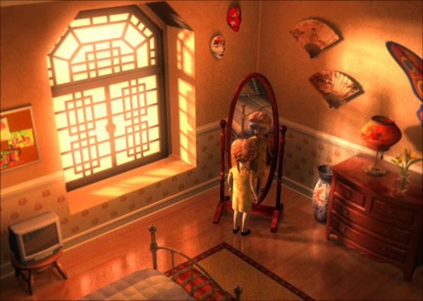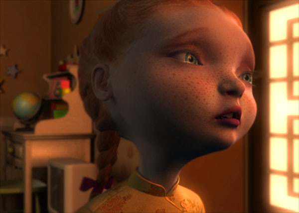 The character, Rachel, was created as part of a one minute trailer promoting an animated feature film in development, to be called "Pandarama." Daniel Robichaud was responsible for the Directing, Scene Design, Lighting, and Compositing. Michelle Deniaud did the Art Direction, Character Design, and Textures; Stephane Couture was responsible for the Animation; Gonzalo Garramuno did the Character Setup and Subdivision Surfaces Plugin; and Jeff Wagner was responsible for the Modelling. Originally from Montreal, Quebec, Daniel Robichaud has worked as an Animation Supervisor at Digital Domain, and contributed to the films Apollo 13, T2-3D (ride film), The Fifth Element, and Titanic, as well as creating the award-winning short Tightrope. You can find more about his current and previous productions on his web site, www.danielrobichaud.com. Softimage was the 3D software used for the project, rendering in Mental Ray. Amazon 3D Paint was used for the facial textures, and Shake was used for compositing. A Subdivision Surfaces plugin had to be developed to allow the modelling of the full head, including ears and brades, as one continuous surface. The UV coordinate system of that surface was set in such a way that a total of 10 different texture maps connected seamlessly to cover it. The same approach was used for the hands. The facial animation system consisted of nulls weighted to the surface, and was used to animate with lipsync. Rachel is supposed to be in an introspective moment, reflecting on a sad memory. The main light source is the late afternoon sun coming from the window, backlighting the girl, and creating a warm, diffused ambience. The scene was broken down into several layers, combined at the compositing stage, in order to allow the depth of field effect, and the glowing, diffused look. |