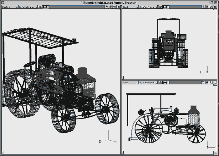 Ron Pfister created this Rumely Thresher in Strata StudioPro on a Mac G3. Purely as a personal project, Ron built the thresher "the same way as it would be built in real life...from the frame up." He painstakingly modeled each component and machine part, based on dozens of his own photographs of the real thresher at a railroad museum, and then assembled and textured them to recreate the full machine. Ron Pfister lives in Prince George, British Columbia, Canada. Ron describes himself as 95% self-taught in 3D graphics, and has practiced and read a number of books over the past two years. You can see more of Ron's work on his web site www.imaginationmagic.com. Near the start of the project, Ron decided on the perspective and camera angle he would use to render the thresher. This way, he was able to build a detailed-looking model, without over-modeling parts that would not show up in the final product. Ron added multiple layers of texture maps, creating oil stains and pitted metal areas. Ron notes that "A mental history of the model is very important in order to get across the proper look and feel" and he tried to create textured dirt in places that would occur in a real machine. "The background and foreground of the Rumely is made up of two separate photographs that were taken last year on the island of Maui. They were composited in Photoshop using a layers mask. After the photos were roughed together, [Ron] went back into StudioPro to readjust the lighting for the thresher so that it would match the lighting in the photos. StudioPro's Shadow Catcher Module was used to create a channel that would later be used to align the shadows in the finished image. "I think that blending a photorealistic image with real world photos was something new for me. I'd always been a bit of a purest when it came to working in 3D. After Rumely was finished I began to experiment with UFO spoofs which were composited in the same way." |
